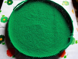 Bloemetje erop (Ik zal volgende keer eens wat patroontjes geven voor verschillende bloemen), uw wol en priemen erin en dan kan je vanaf nu, in stijl, in de tuin breien zonder dat uw wol door het stof en aarde rolt :)