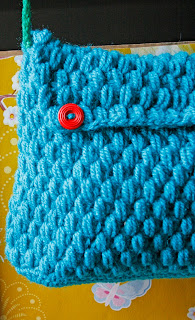 5 Rijen in totaal. Haak de laatste bobbelsteek van elke rij niet, haak een lus, keer om en haak de volgende rij. Zo wordt het flapje smaller bij iedere rij. Eindig, knip de draad af en naai hem in. Naai alvast 2 knopen op de voorkant.